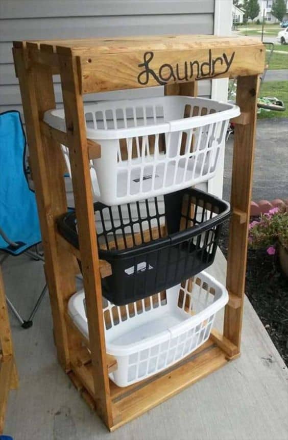 This laundry basket holder made from pallet wood is such a unique and creative idea! Again this is something you can tailor to your specific space and the size and number of laundry baskets that you have. To give you an idea of how to build something similar to the example above, take a look at this step-by-step pallet laundry basket YouTube video.