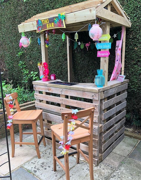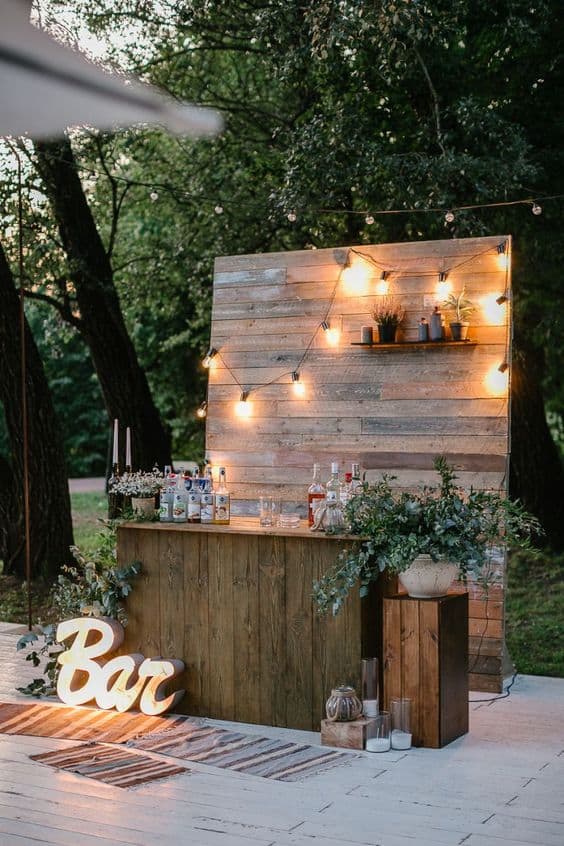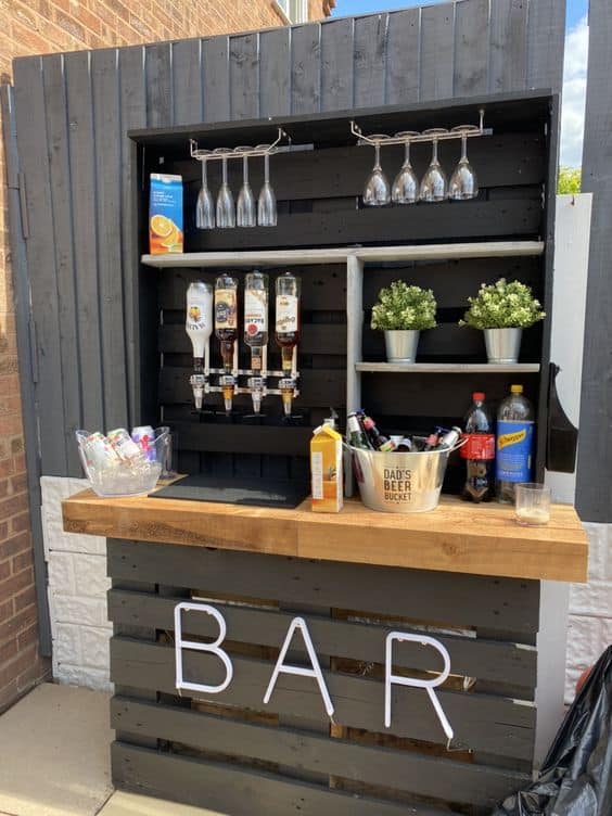 Last by certainly not least, use your old pallets to create a unique and functional bar that can serve guests at weddings, birthdays, and other special occasions. By sanding and staining the pallets, they can be transformed into a stylish and rustic bar that can add character to any event. The bar can then be customised with shelves and compartments to hold glasses, bottles, and other bar essentials. Pallet bars are not only sustainable and environmentally friendly, but they also provide a cost-effective alternative to renting a bar for your event. They make a great focal point and conversation starter while keeping guests refreshed and entertained. We think you’ll love these pallet bar examples;