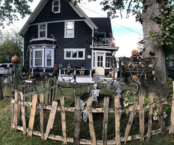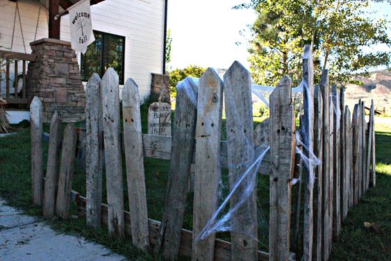Transform ordinary pallets into eerie fences that set the perfect backdrop for your Halloween display. Simply disassemble the pallets and arrange the planks vertically or diagonally. Add a coat of weathered paint in eerie shades like black or grey for an aged, haunted look. You can even drape fake cobwebs and creepy crawlies for an extra spooky touch.