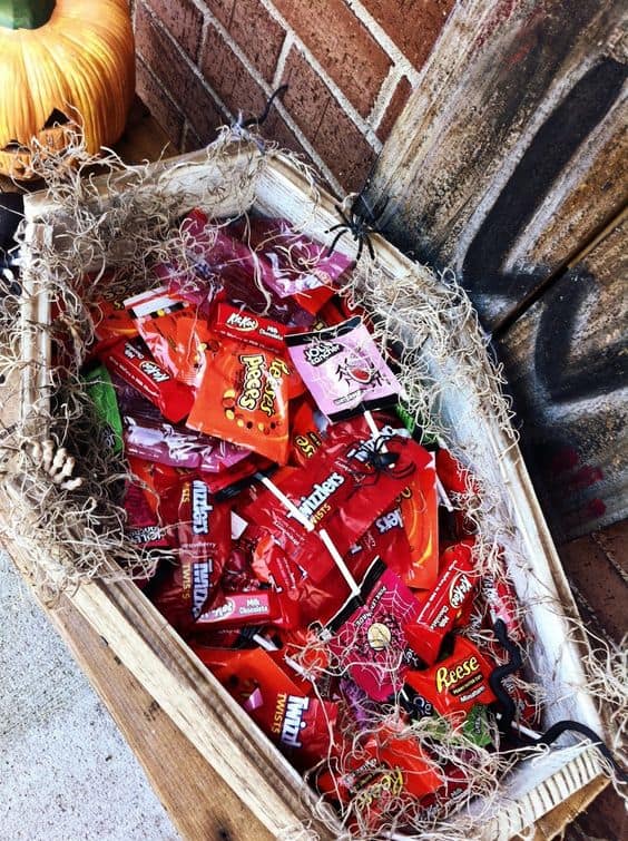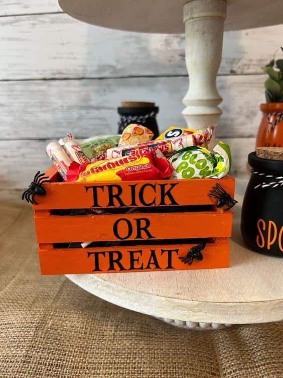 Welcome trick-or-treaters with unique, handmade crates for their candy haul. Construct small crates using pallet wood and stencil spooky messages or Halloween motifs on them. Fill them with candies or small trinkets to delight your young visitors. These crates can also double as charming decorations for your porch.