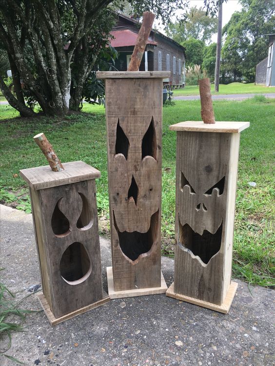 Give traditional pumpkin carving a twist by making pallet jack-o’-lanterns. Cut out pumpkin shapes from pallet wood, leaving a hollow space in the middle. Add eerie faces or intricate designs with a jigsaw or woodburning tool. Place battery-powered candles inside for a safe and eerie glow.